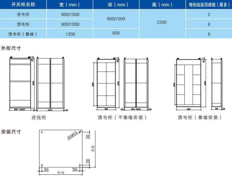4、靠墙式安装是专为操作空间有限的环境设计的,柜后封板封闭,垂直母线区设置在柜的中后部分,进出线电缆在前面。