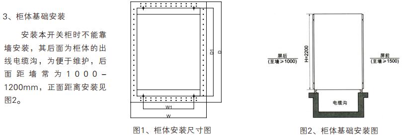 用户应根据制造公司提供的柜体底脚尺寸预先做好槽钢基础,然后将柜体就位,紧固底脚和柜间连接螺栓及安装水平母线,母线的连接须牢固可靠。根据进出电缆的数量,用户可在柜体底板上敲开敲落孔,引入电缆。