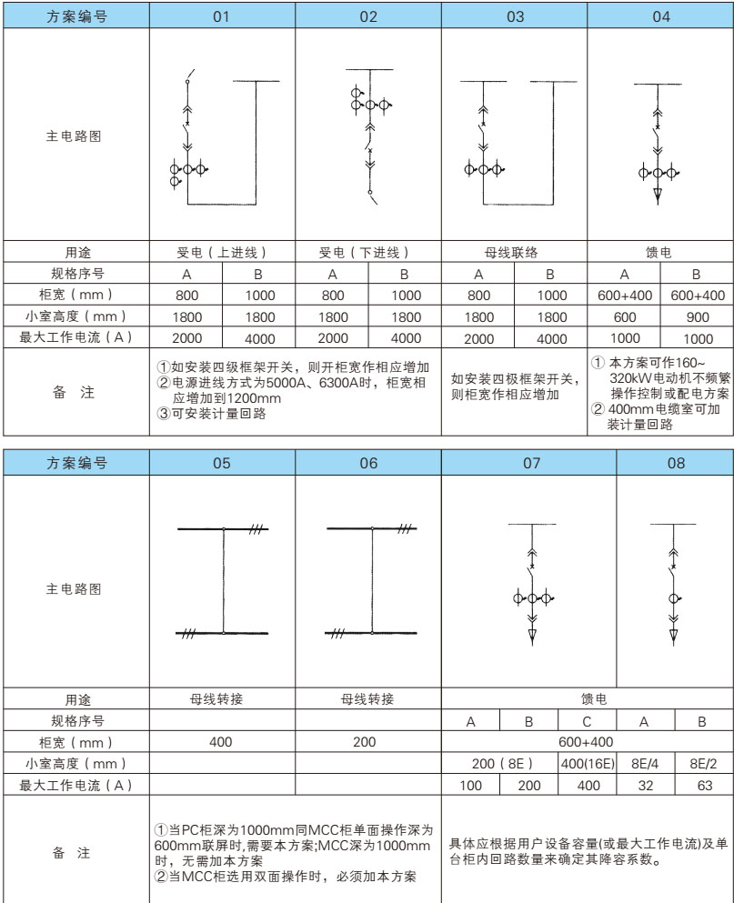 5. 柜体根据用户使用的功能不同可分为受电柜、母联柜、出线柜(包括动力中/心PC和电动机控制中/心MCC)、无功功率补偿四种;