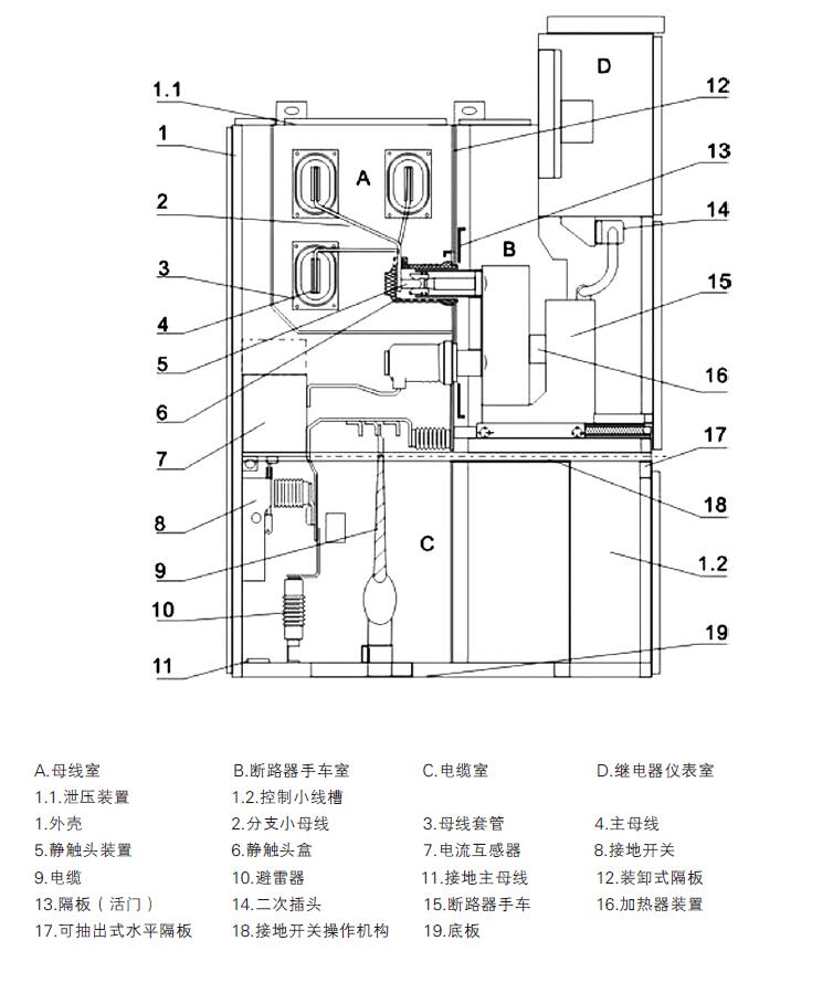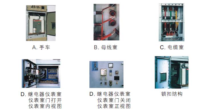个不同的功能单元:母线室、断路器室、电缆室和低压室。每一单元外壳均独立接地。