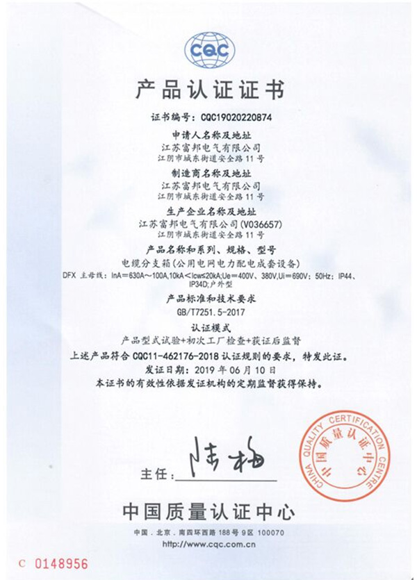GCK低压配电柜(低压成套开关设备)II型自愿认证产品认证证书(400~1600A)